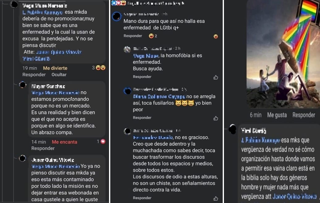También los comentarios en redes sociales de algunos guardias indígenas donde su planteamiento no coincide con el discurso y ejercicio político de defensa de la vida. “Mano dura para que así no haya esa enfermedad de LGTBIQ+”, “Maricadas, gays, lesbianas ni deberían estar en la organización, que vergüenza”, “La gente está loca y desocupada, lastimosamente no se puede erradicar esa fea enfermedad por que se creen muy vulnerables malditos lgtbi [sic] ”.
